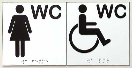 Grâce à nos plaques WC braille standards, avec un marquage du logo en relief en Gravotac épaisseur 0,8mm, plus un marquage braille (billes inox) sur Gravotac Epaisseur 1,5mm, il est facile d'équiper et ainsi de mettre aux normes les espaces publics type salle des fêtes ou de spectacle, ou restaurants et hôtels... nous vous proposons par exemple des plaques : plaque WC braille / Mal voyant, Homme, Femme et Handicapés.